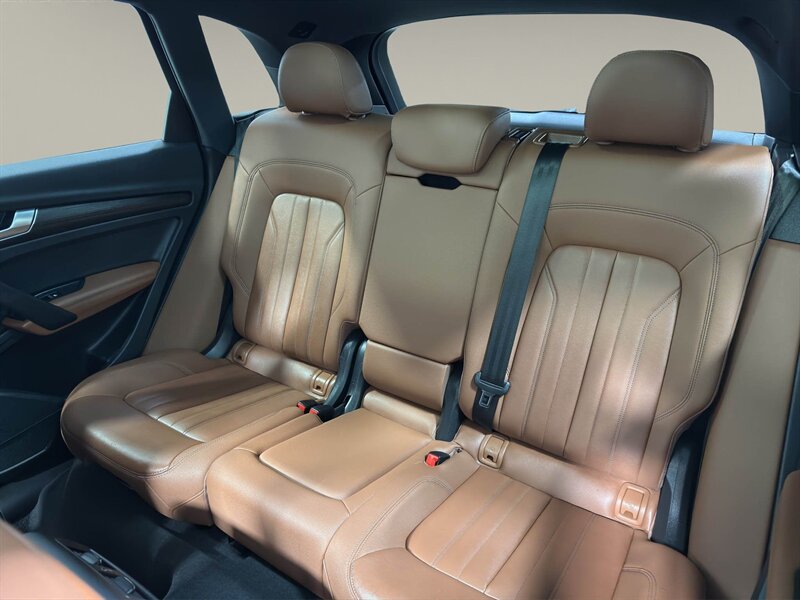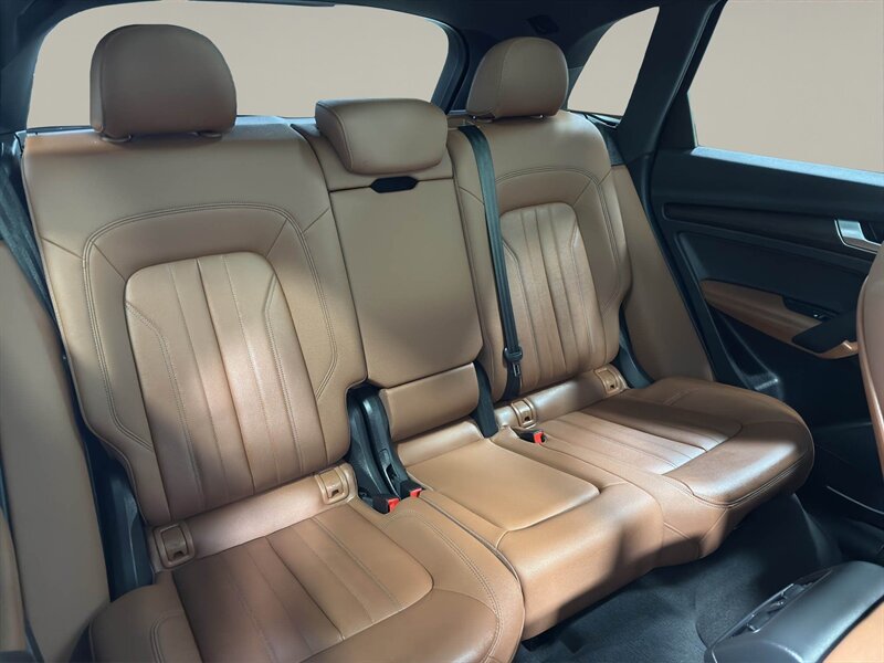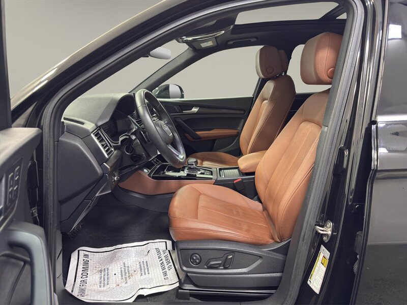 2021 Audi Q5 Premium Plus 45 TFSI quattro S tronic finished in Mythos Black Metallic with Okapi Brown interior. Powered by a 2.0L mild-hybrid e-turbo I4 producing 261 hp and 273 lb-ft paired to Audi’s quattro all-wheel drive and 7-speed S tronic transmission (23 MPG city / 28 MPG highway). Factory equipment includes 19" alloy wheels, full LED exterior lighting, panoramic sunroof, power liftgate, keyless entry/advanced key, leather seating with heated front seats and power/memory driver seat, tri-zone automatic climate control, Audi MMI Navigation Plus with MMI touch, Audi virtual cockpit, Apple CarPlay/Android Auto, Bluetooth/USB connectivity, parking system with front/rear sensors and rearview camera, Audi drive select and Audi pre sense safety systems. Vehicle is in excellent overall condition, has a clean CARFAX and one prior owner.